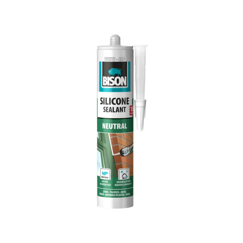 POUŽITIE: Neutrálny silikón je vhodný na tmelenie škár vo väčšine poréznych a neporéznych materiálov, ako je kameň, murivo, tehly, hliník, U-PVC, polyakrylát, polykarbonát, polystyrén, drevo, sklo a pozinkované povrchy atď. Je obzvlášť vhodný na zasklievanie, utesňovanie obkladov budov a na vysoko pohyblivé škáry. Je vhodný aj na tmelenie, lepenie a utesňovanie pri inštalácii akrylátových vaní, vaničiek, sprchových kútov a podobných nádob. Nie je vhodný pre PE, PP, PTFE a bitúmen.